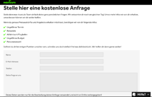Der schnellste Weg seine Anfrage an uns zu senden ist die Schnellanfrage, direkt oben auf der Startseite. Hier erscheint ein Formular, wo ihr eure Frage, euren Namen und eure E-Mail-Adresse eingeben könnt. Ihr schickt ihr uns so eine Nachricht, die direkt in die Anfrageabteilung geleitet wird. Wir melden uns dann so schnell wie möglich bei dir 😉